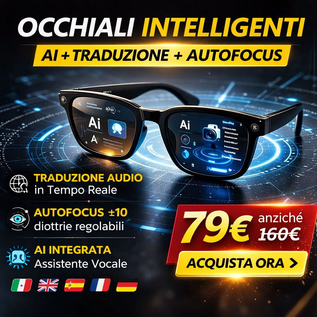 Traduzione simultanea in ogni lingua, regolazione automatica della vista ±10 diottrie, AI con comandi vocali e mappe, audio integrato sulle stecche e fotocamera 4K ultra nitida.
